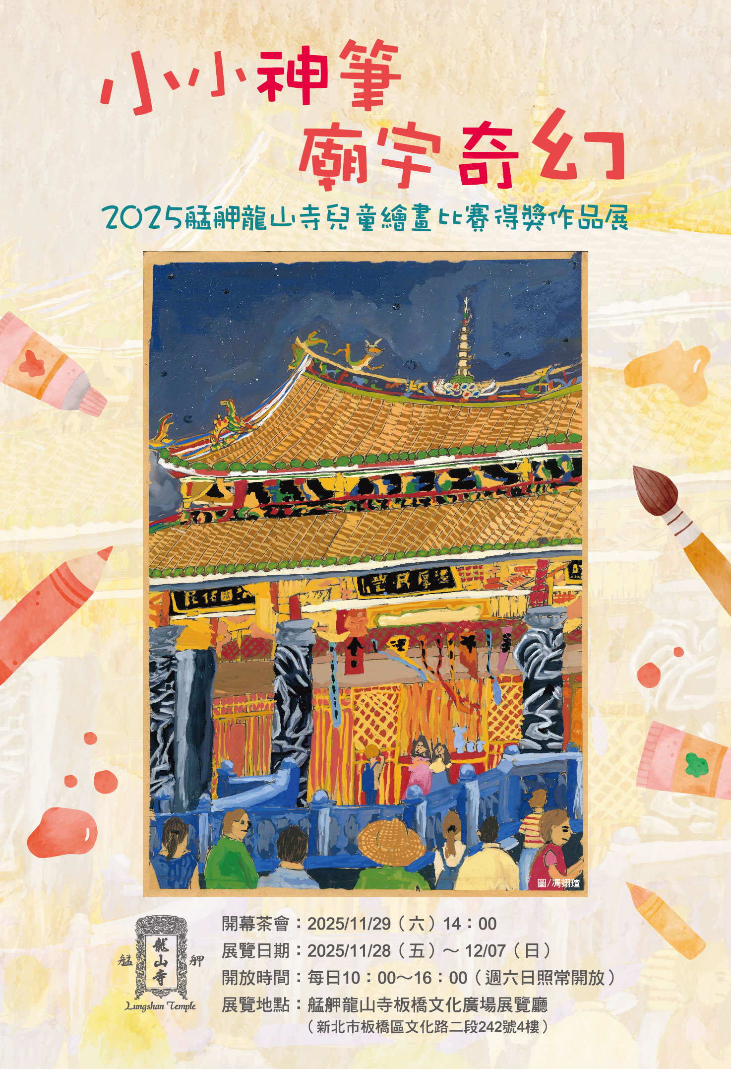 艋舺龍山寺於2025年春季舉辦兒童繪畫比賽,邀請孩童以五彩畫筆描繪神明、廟宇與節慶風貌。