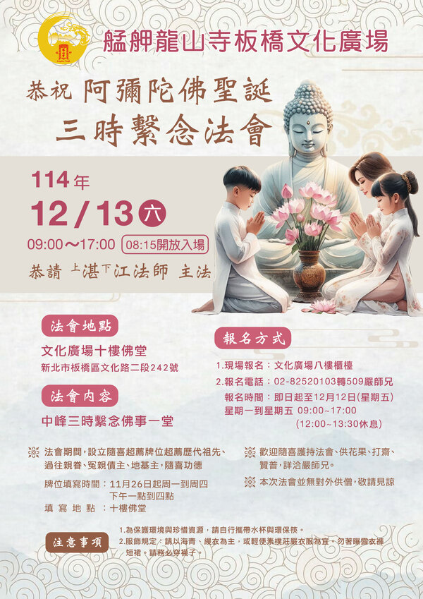 法會地點:文化廣場十樓佛堂(新北市板橋區文化路二段242號)