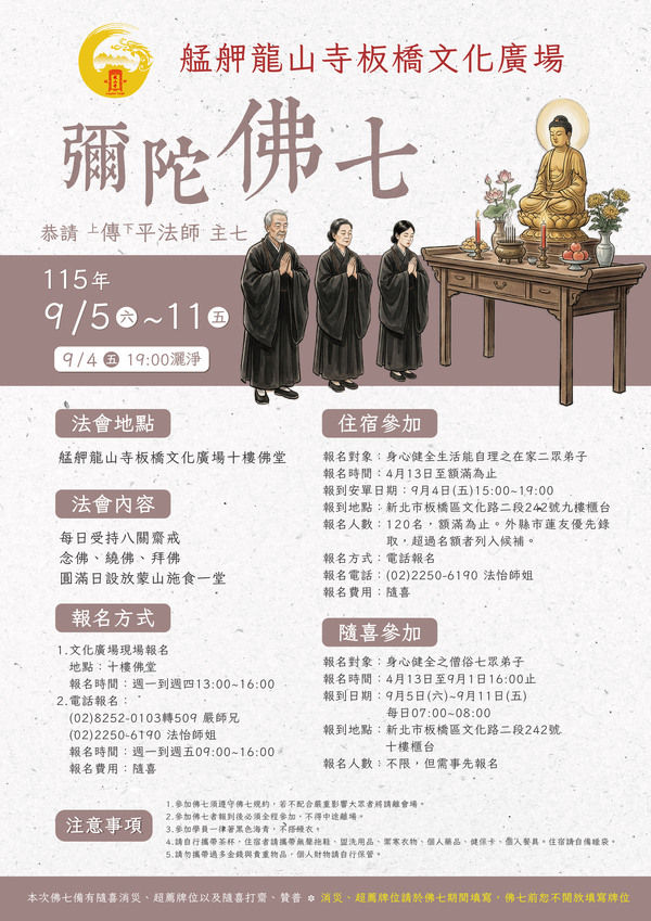 佛七時間:115年9月5日(六)~9月11日(五),9月4日(五)19:00灑淨