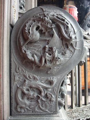 以青斗石雕成的抱鼓石是穩定門柱的構件,三川殿前2座抱鼓石為鼓破龍出雕刻,右「雙龍搶珠」、左「蒼龍教子」,頗具教育意義,其下方則雕有文官手持「旗、球、戟、磬」,表達「祈求吉慶」的心願;石鼓後方分別刻有「馬上見喜」與「封侯受祿」,意為進廟門,滿載歸。